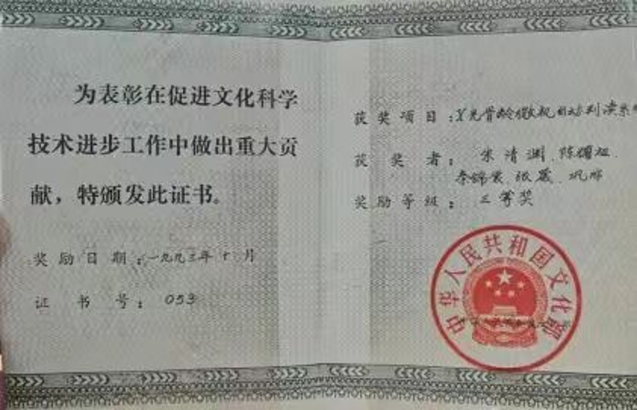 文化部“促進(jìn)文化科學(xué)技術(shù)進(jìn)步工作三等獎(jiǎng)”證書(shū)